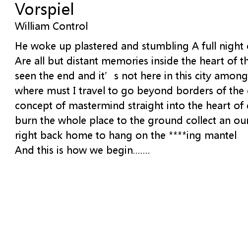 | He woke up plastered and stumbling A full night of gin, pale sweat and seduction Are all but distant memories inside the heart of this shattered beast I have seen the end and it' s not here in this city amongst the beggars and the liars where must I travel to go beyond borders of the clinically insane far past the concept of mastermind straight into the heart of disbelief light a match and burn the whole place to the ground collect an ounce of the ash and bring it right back home to hang on the ing mantel | |