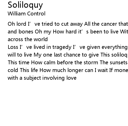 | Loss I’ve lived in tragedy I’ve given everything My soliloquy Loss My savage will to live My one last chance to give This soliloquy | |