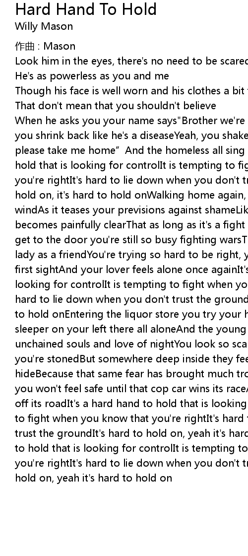 | When he asks you your name says" Brother we' re all here in the same game" But you shrink back like he' s a diseaseYeah, you shake and you moan, you say" Oh please take me home" And the homeless all sing the repriseIt' s a hard hand to hold that is looking for controlIt is tempting to fight when you know that you' re rightIt' s hard to lie down when you don' t trust the groundIt' s hard to hold on, it' s hard to hold onWalking home again, there comes a battle with the windAs it teases your previsions against shameLike all that wax in your hair it becomes painfully clearThat as long as it' s a fight you' ll never winAnd when you get to the door you' re still so busy fighting warsThat you can' t look upon your lady as a friendYou' re trying so hard to be right, you miss the love in that first sightAnd your lover feels alone once againIt' s a hard hand to hold that is looking for controlIt is tempting to fight when you know that you' re rightIt' s hard to lie down when you don' t trust the groundIt' s hard to hold on, it' s hard to hold onEntering the liquor store you try your hardest to ignoreThat street sleeper on your left there all aloneAnd the young man on your right with unchained souls and love of nightYou look so scared they laugh and wonder if you' re stonedBut somewhere deep inside they feel the pain they' ve learned to hideBecause that same fear has brought much trouble on their homesAnd they know you won' t feel safe until that cop car wins its raceAnd another life is driven off its roadIt' s a hard hand to hold that is looking for controlIt is tempting to fight when you know that you' re rightIt' s hard to lie down when you don' t trust the groundIt' s hard to hold on, yeah it' s hard to hold onIt' s a hard hand to hold that is looking for controlIt is tempting to fight when you know that you' re rightIt' s hard to lie down when you don' t trust the groundIt' s hard to hold on, yeah it' s hard to hold on |