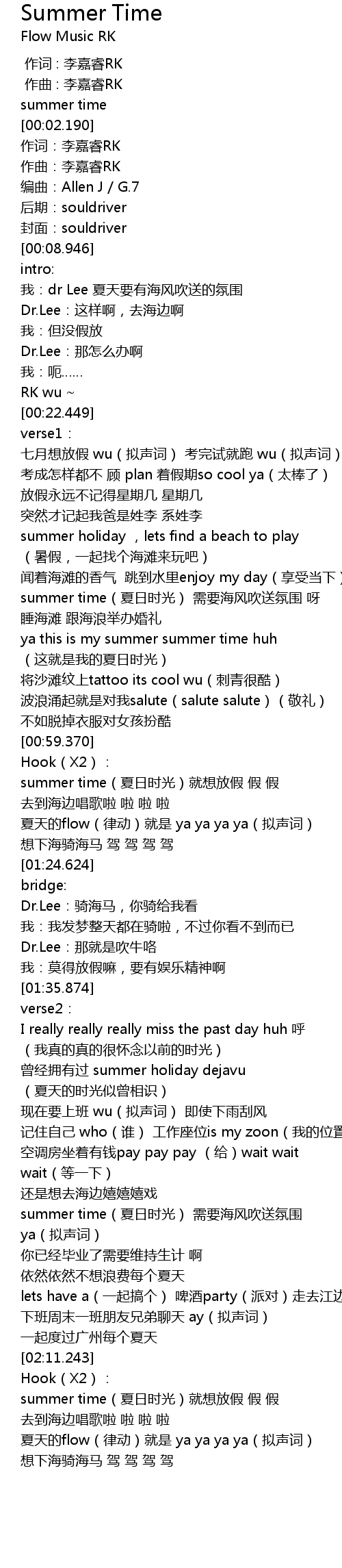 | [02:11.988] | summer time xià rì shí guāng jiù xiǎng fàng jià jiǎ jiǎ |