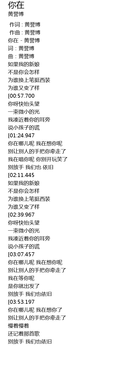 | [00:02.196] | 你在 - 黄誉博 |
