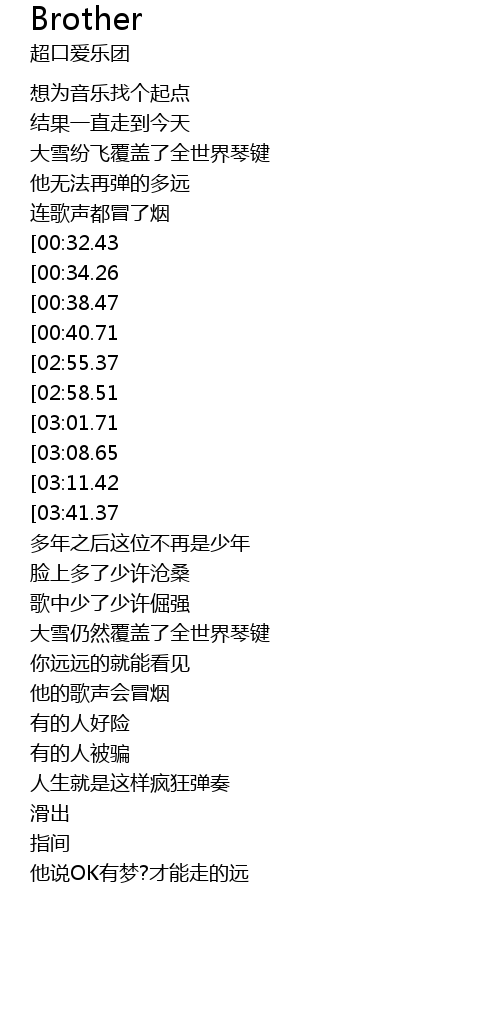 | [03:21.72][02:55.37][02:15.76][00:48.88] | 哥哥说byebye my brother |