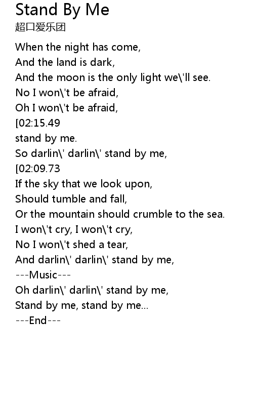 | [02:57.66][02:15.49][01:54.62][01:12.18][00:51.32] | Just as long as you stand, stand by me. |