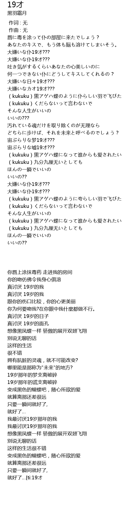 | [02:52.333] | (kukuku)黒アゲハ蝶のように夸らしい羽で飞びたい |