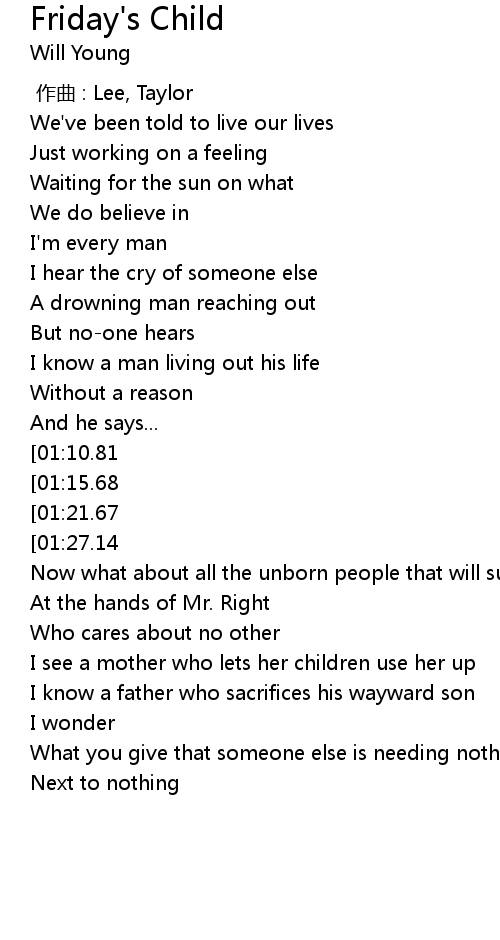 | [02:49.21][01:27.14] | But Friday's child was born to give |