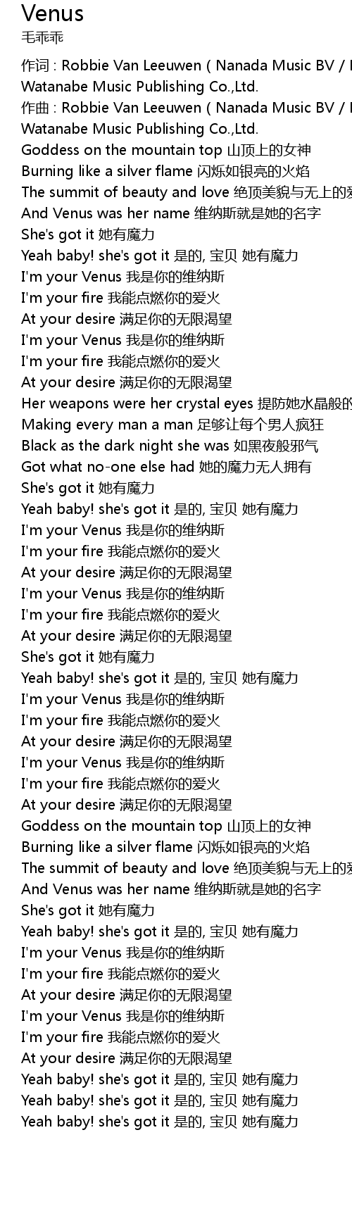 | And Venus was her name wéi nà sī jiù shì tā de míng zì | |