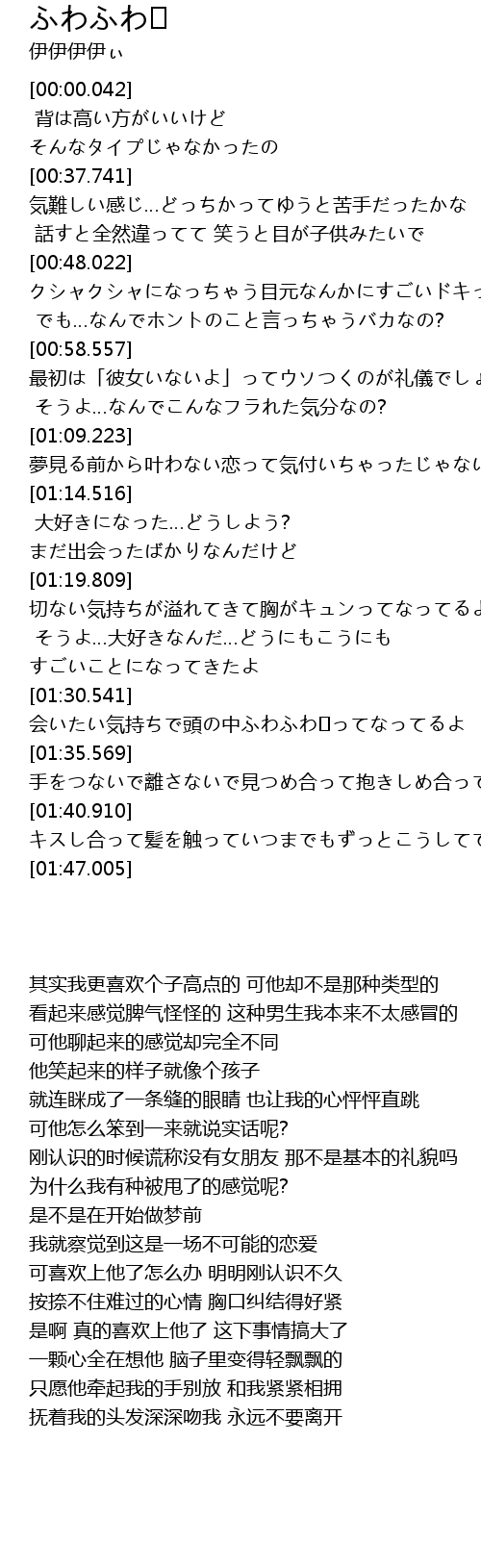 | [01:40.910] | キスし合って髪を触っていつまでもずっとこうしてて |