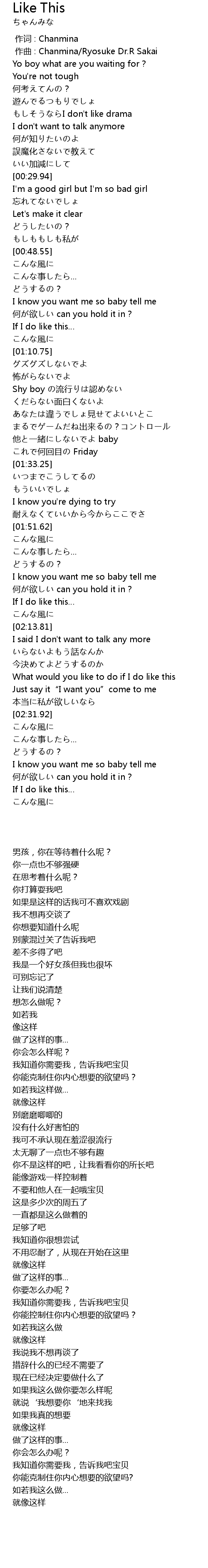 | [00:01.00] | 作曲 : Chanmina/Ryosuke Dr.R Sakai |