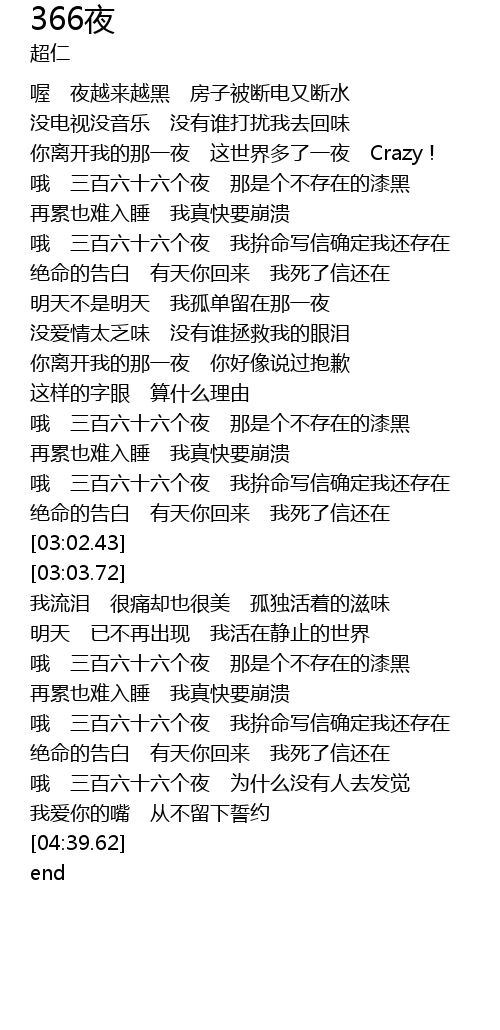 | [02:39.58] | ó sān bǎi liù shí liù ge yè wǒ pàn mìng xiě xìn què dìng wǒ hái cún zài |