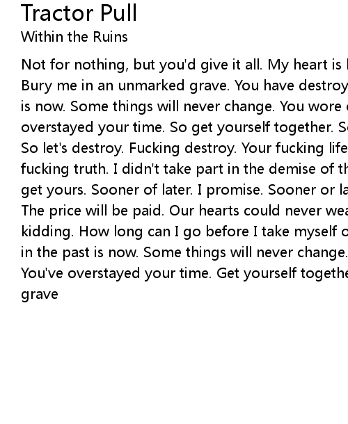 Not for nothing, but you'd give it all. My heart is blackened with your lies. Bury me in an unmarked grave. You have destroyed everything. Living in the past is now. Some things will never change. You wore out your welcome. You've overstayed your time. So get yourself together. Some things will never change. So let's destroy. Fucking destroy. Your fucking life. No one wants to see the fucking truth. I didn't take part in the demise of thousands. I promise you'll get yours. Sooner of later. I promise. Sooner or later. Judgment will be paid. The price will be paid. Our hearts could never weather the storm. Who were we kidding. How long can I go before I take myself out. How long can I go. Living in the past is now. Some things will never change. You wore out your welcome. You've overstayed your time. Get yourself together. Throw me in an unmarked grave