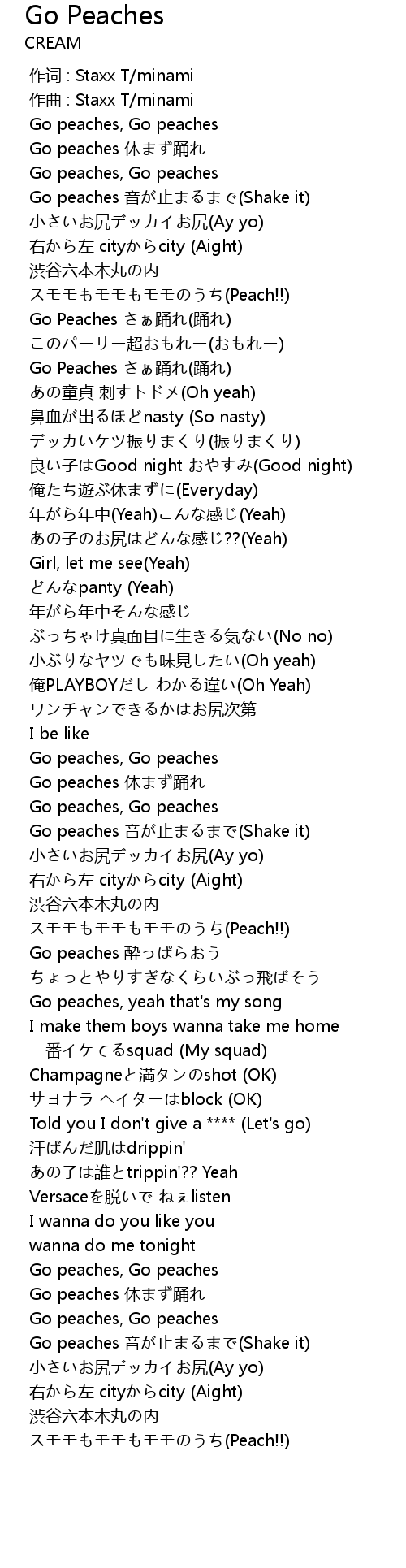 | [01:56.053] | Go peaches 音が止まるまで(Shake it) |