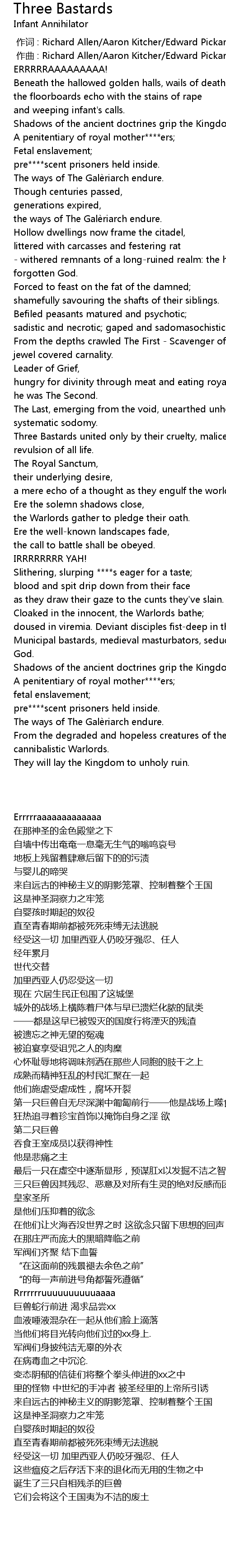 | [03:38.96] | Municipal bastards, medieval masturbators, seduced by the scripture of God. |
