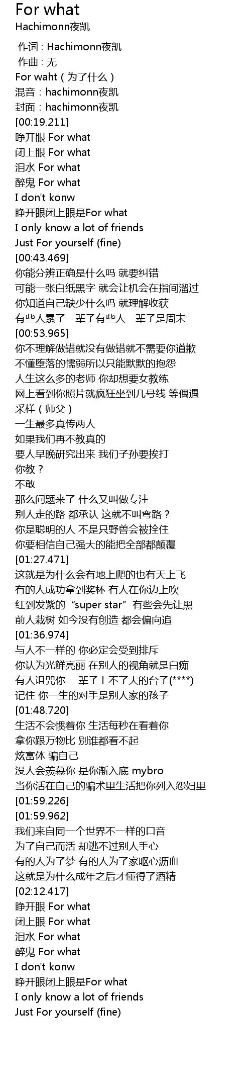 | [02:29.409] | 睁开眼闭上眼是For what |