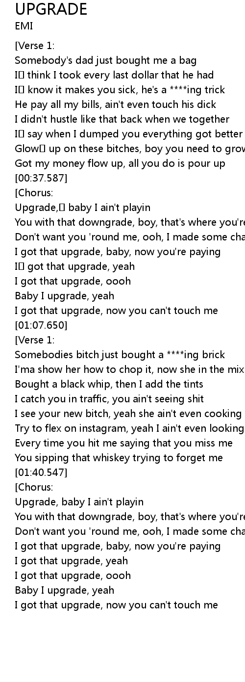 | [01:43.058] | Upgrade, baby I ain' t playin |
