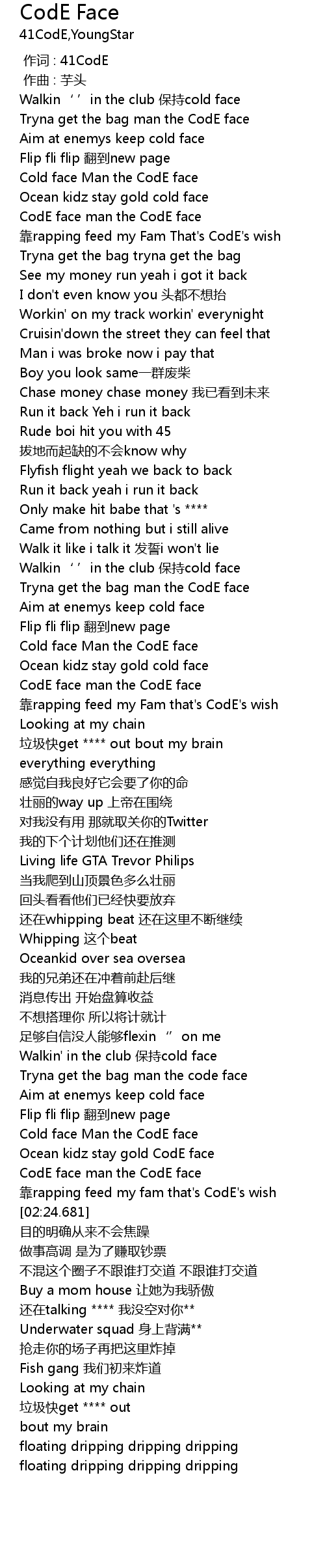 | [00:09.928] | Walkin' ' in the club bao chi cold face |