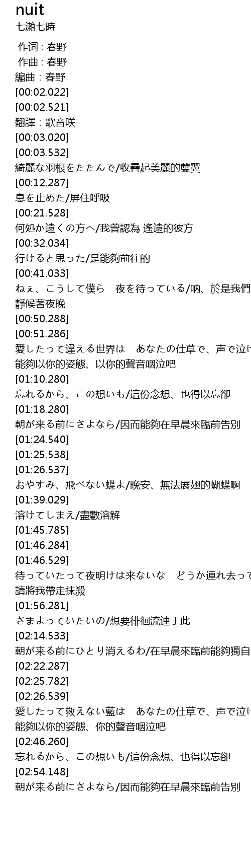 | [02:56.391] | 朝が来る前にさよなら/因而能夠在早晨來臨前告別 |