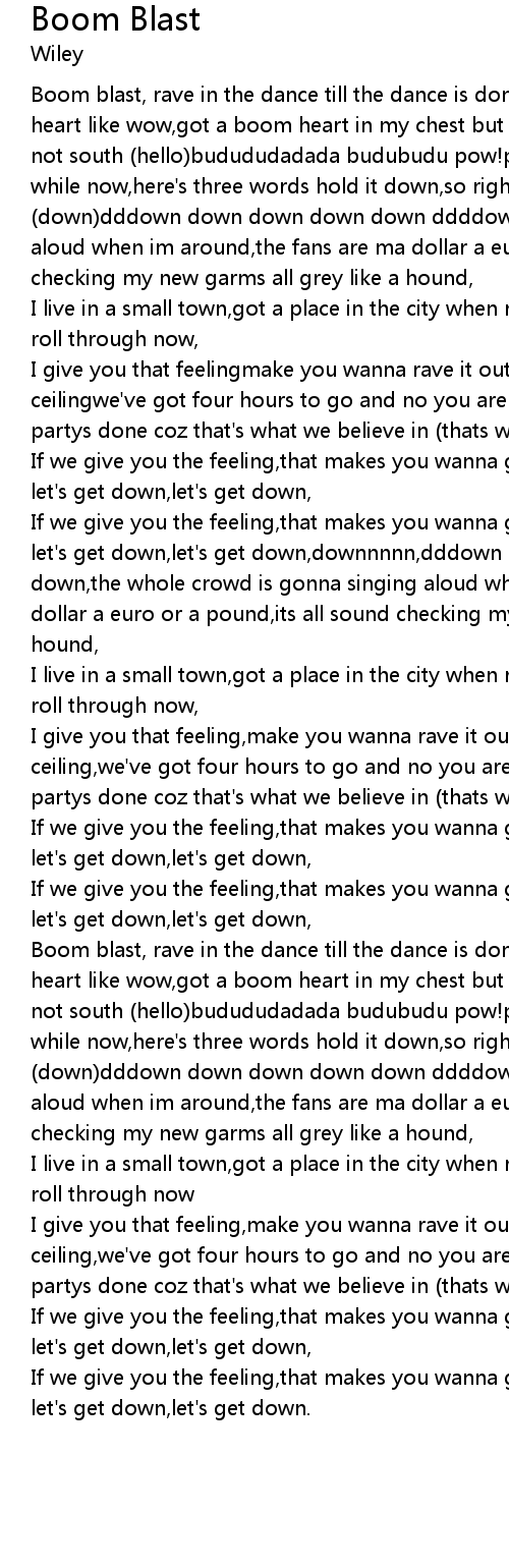 Boom blast, rave in the dance till the dance is done, ladies playing with my heart like wow,got a boom heart in my chest but how,when i flow cold north pole not south (hello)budududadada budubudu pow!peace love in my heart it's been a while now,here's three words hold it down,so right now i am gonna hold downnnnn (down)dddown down down down down ddddown down,the whole crowd is gonna singing aloud when im around,the fans are ma dollar a euro or a pound,its all sound checking my new garms all grey like a hound, |