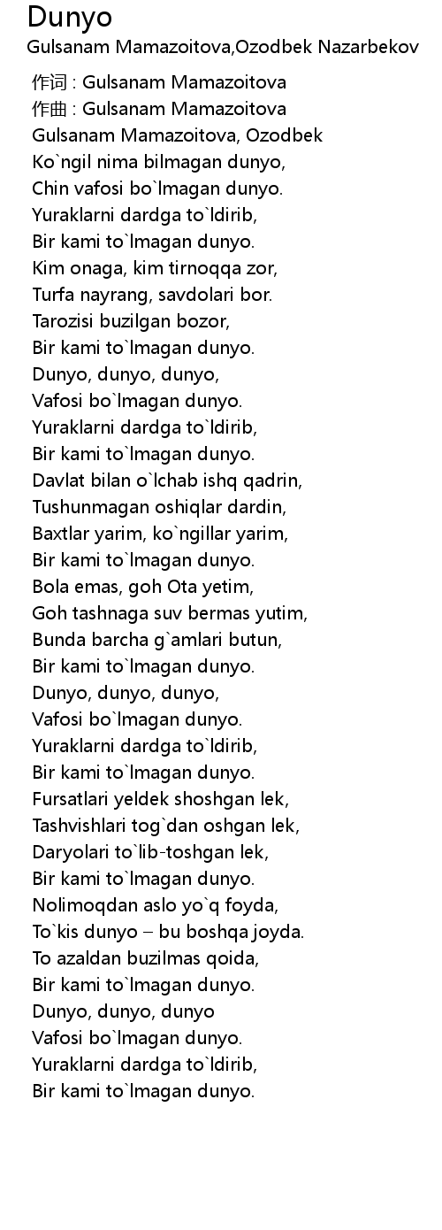 | [00:00.000] | 作词 : Gulsanam Mamazoitova |