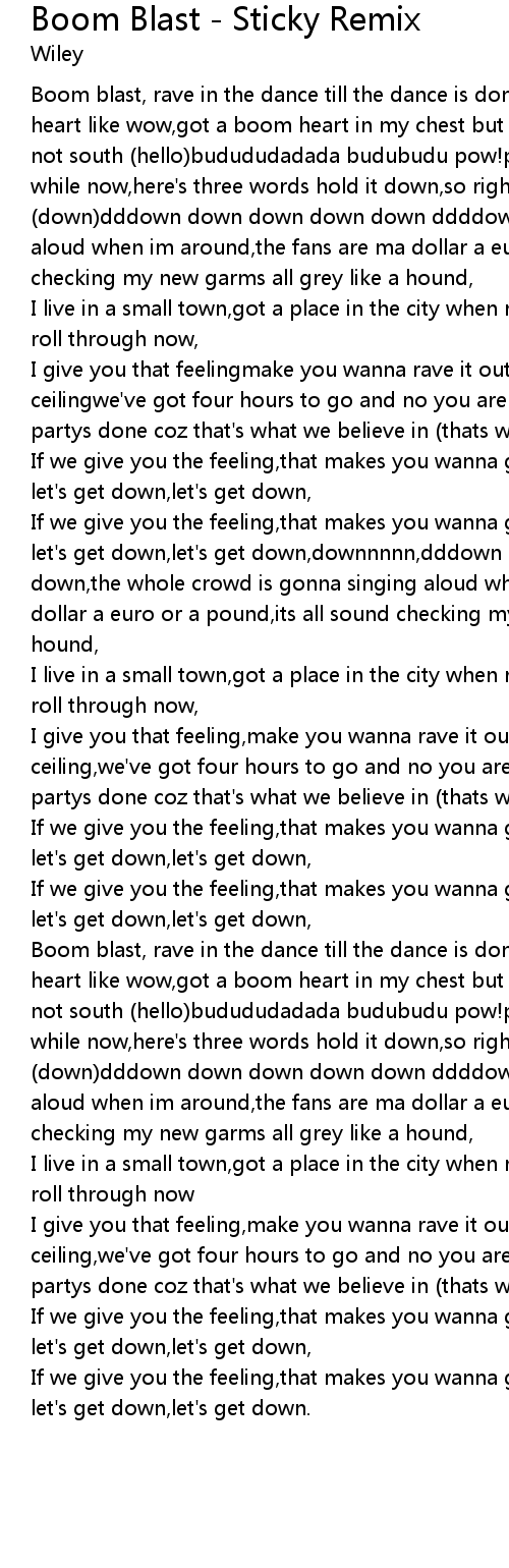 Boom blast, rave in the dance till the dance is done, ladies playing with my heart like wow,got a boom heart in my chest but how,when i flow cold north pole not south (hello)budududadada budubudu pow!peace love in my heart it's been a while now,here's three words hold it down,so right now i am gonna hold downnnnn (down)dddown down down down down ddddown down,the whole crowd is gonna singing aloud when im around,the fans are ma dollar a euro or a pound,its all sound checking my new garms all grey like a hound, |
