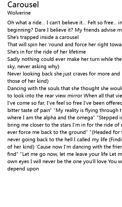 Dancing with the souls that she thought she would never find "Why should I care to look into the rear view mirror When all that view has to offer me is misery? I've come so far, I've feel so free I've been offered a sip of life without the bitter taste of pain" "My reality is flying through the air of my dreams Dreams where I am the alpha and the omega" "Stepped into a carousel To lift me up and bring me closer to the stars I'm in for the ride of my lifetime Nothing could ever force me back to the ground" "(Headed for the sky, giving up past life) I'm never going back to the hell I called my life (Finding peace of mind with those of her kind) 'Cause now I'm dancing with the friends that I though I would never find" "Let me go now, let me leave your life Let me feel free, let me see with own eyes I will never be the one you'll love You will never be the ones I'll depend upon