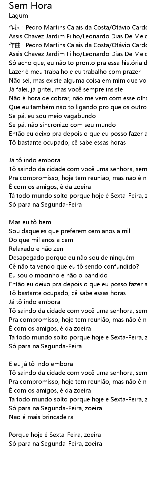 | 作词 : Pedro Martins Calais da Costa/Otávio Cardoso Furtado/Francisco De Assis Chavez Jardim Filho/Leonardo Dias De Melo/Glauco De Souza Borges | |