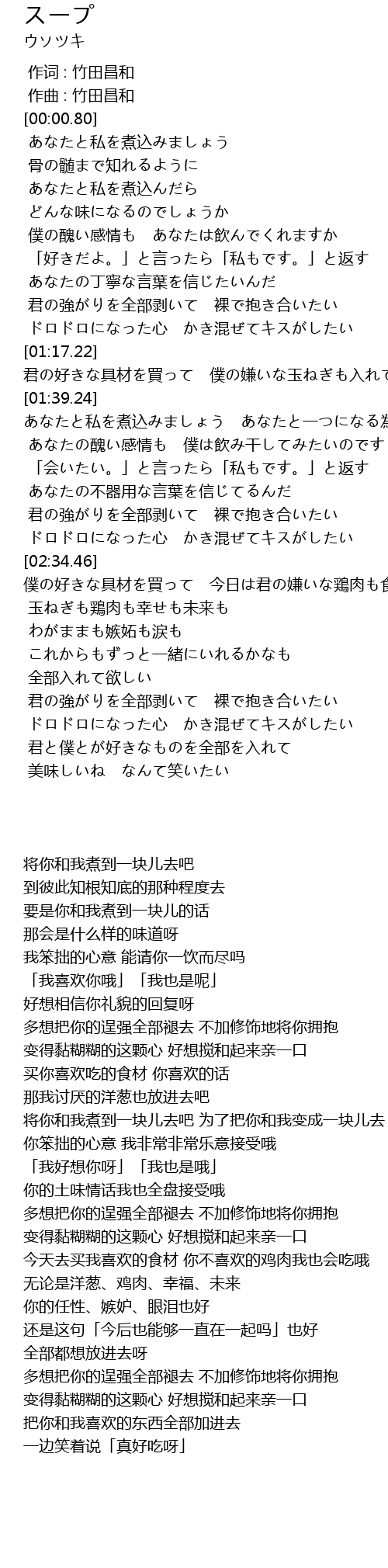 | [01:39.24] | あなたと私を煮込みましょう あなたと一つになる為に |