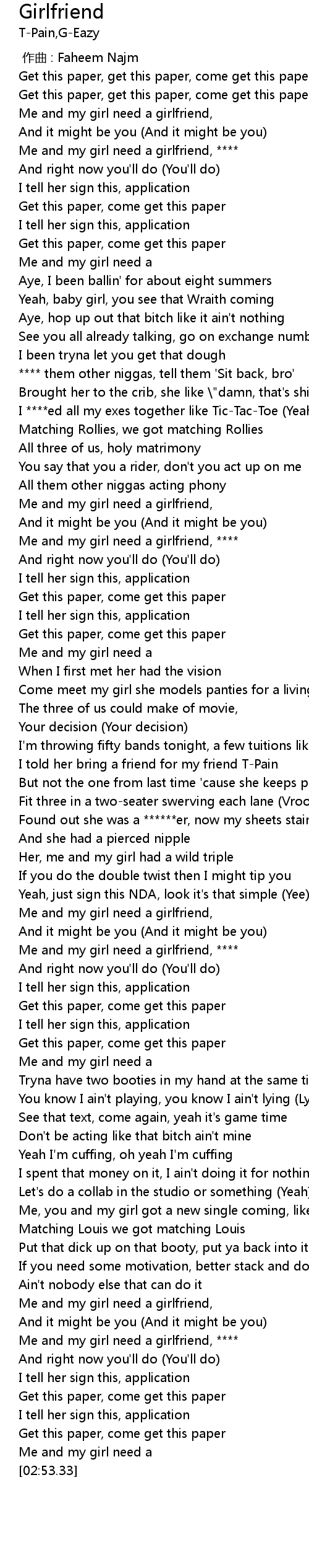 | [02:37.60] | Me and my girl need a girlfriend, **** |