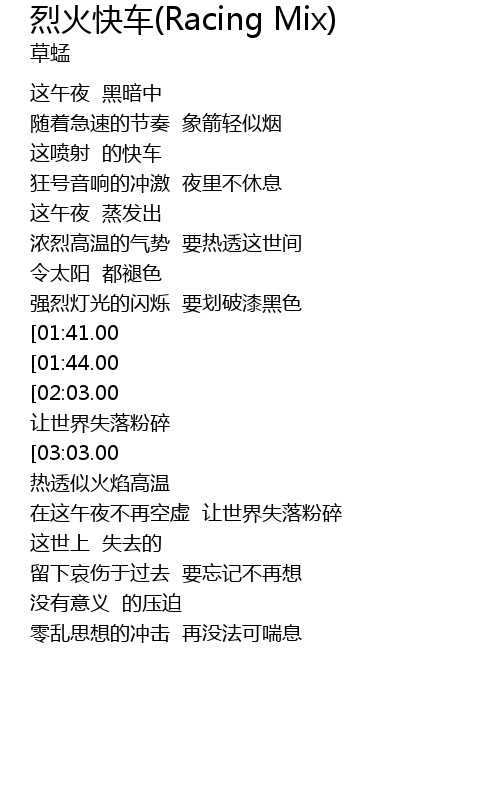 | [02:52.00][01:44.00][01:06.00] | 高速中竞赛剌激 |