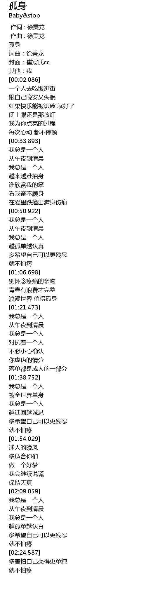 | [02:11.063] | wǒ zǒng shì yí ge rén |