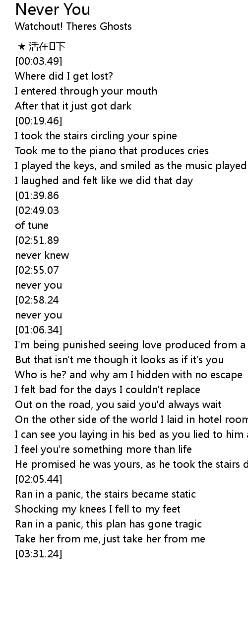 | [03:10.71][02:58.24][02:45.61][02:01.75][01:49.25][00:59.04] | Was never you, was never you |