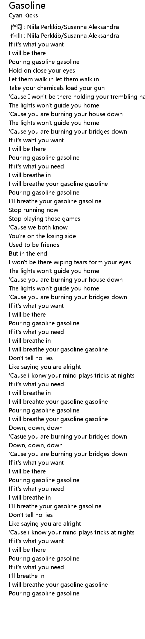 | [00:54.76] | Pouring gasoline gasoline |