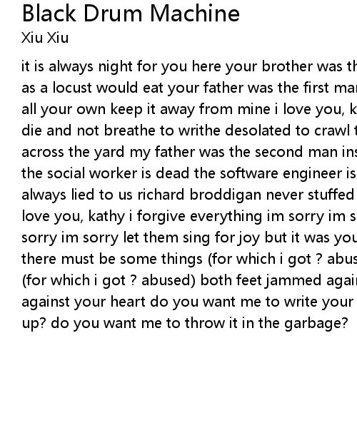 | it is always night for you here your brother was the first boy inside of you and as a locust would eat your father was the first man inside of you your body is all your own keep it away from mine i love you, kathy you forgive everything to die and not breathe to writhe desolated to crawl towards colorlessness the grass across the yard my father was the second man inside of you the sailor is dead the social worker is dead the software engineer is dead the singer is dead youve always lied to us richard broddigan never stuffed his underwear in your mouth i love you, kathy i forgive everything im sorry im sorry im sorry im sorry im sorry im sorry let them sing for joy but it was you to whom the raven called there must be some things (for which i got ? abused) there must be some things (for which i got ? abused) both feet jammed against your heart both feet jammed against your heart do you want me to write your name? do you want me to tear it up? do you want me to throw it in the garbage? |