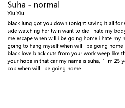 | black lung got you down tonight saving it all for work suha pins her arms to her side watching her twin want to die i hate my body, i hate the desert please let me escape when will i be going home i hate my husband, i hate my children i' m going to hang myself when will i be going home black hair got you down tonight black love black cuts from your work weep like the busted girl you are wash down your hope in that car my name is suha, i' m 25 years old i' m going to hump a cop when will i be going home |