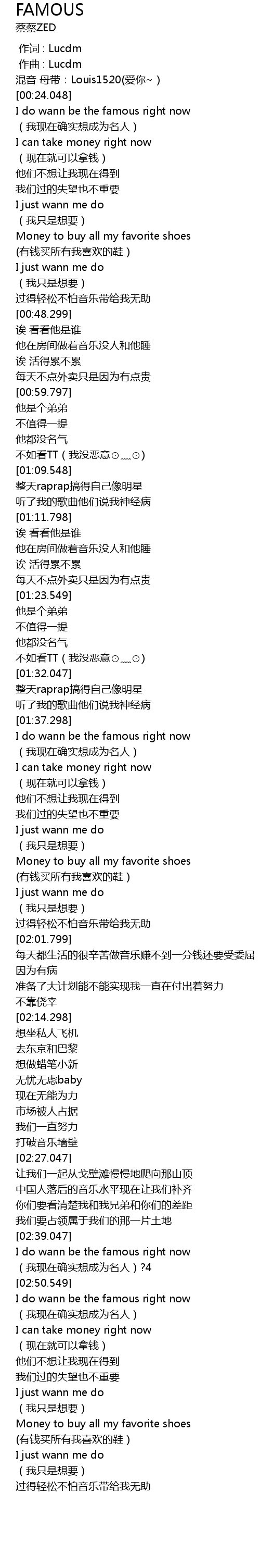 | [02:52.548] | I do wann be the famous right now |