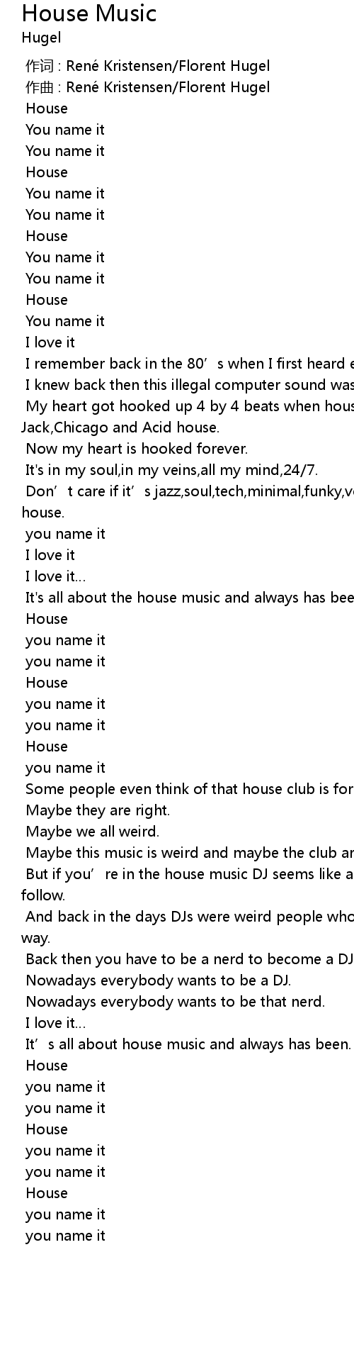 | [00:50.31] | Don’t care if it’s jazz,soul,tech,minimal,funky,vocal or hip house. |