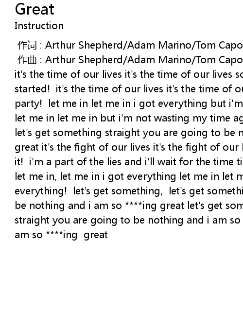 | [00:00.00] | it's the time of our lives it's the time of our lives so let's get started! it's the time of our lives it's the time of our lives so join the party! let me in let me in i got everything but i'm not wasting my time again let me in let me in but i'm not wasting my time again let's get something, let's get something straight you are going to be nothing and i am so ****ing great it's the fight of our lives it's the fight of our lives so make me want it! i'm a part of the lies and i'll wait for the time till you will buy it! let me in, let me in i got everything let me in let me in got more then everything! let's get something, let's get something straight you are going to be nothing and i am so ****ing great let's get something, let's get something straight you are going to be nothing and i am so ****ing great great great and i am so ****ing great |