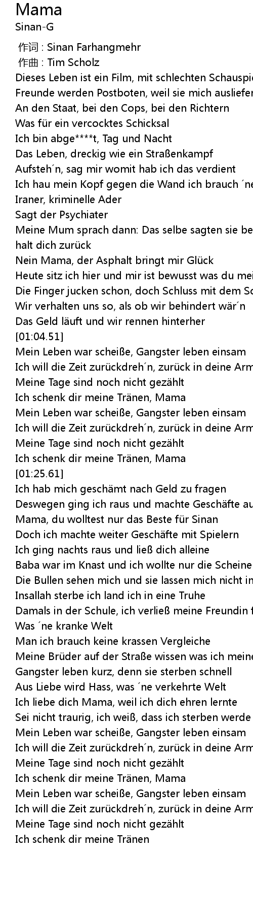 | [01:30.22] | Mama, du wolltest nur das Beste fü r Sinan |