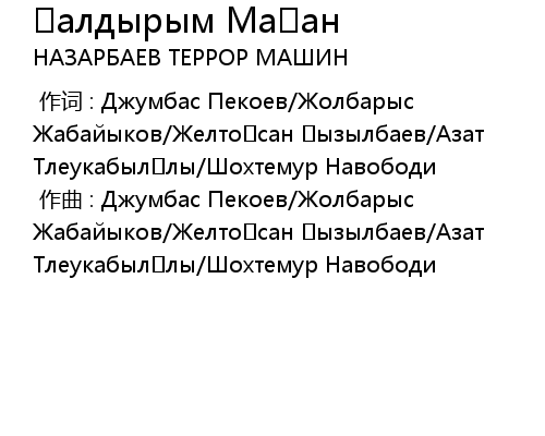 | [00:00.00-1] | 作曲 : Джумбас Пекоев/Жолбарыс Жабайыков/Желтоқсан Қызылбаев/Азат Тлеукабылұлы/Шохтемур Навободи |