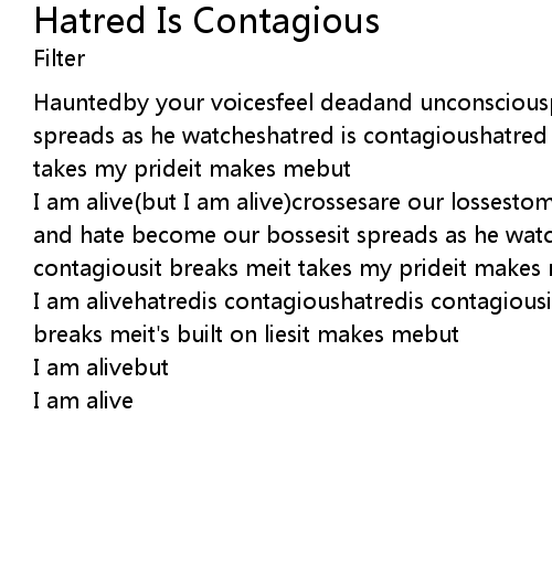 I am alive(but I am alive)crossesare our lossestombstonesmake our fossilspain and hate become our bossesit spreads as he watcheshatred is contagioushatred is contagiousit breaks meit takes my prideit makes mebut |