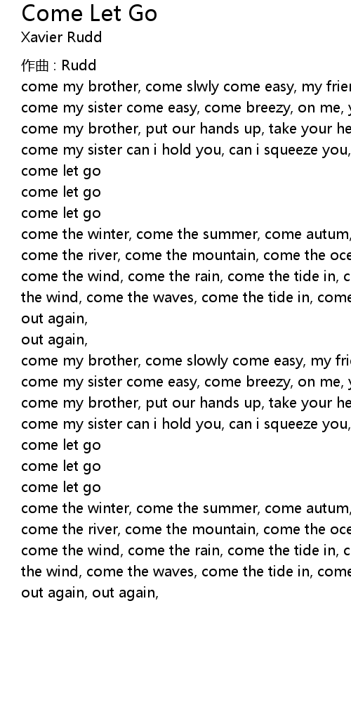| come the river, come the mountain, come the ocean, come the trees, you will see, come the wind, come the rain, come the tide in, come the tide out again, come the wind, come the waves, come the tide in, come the tide out again, | |