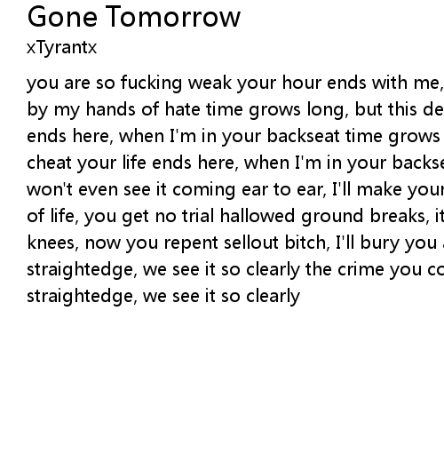 you are so fucking weak your hour ends with me, reality strikes inflicting death by my hands of hate time grows long, but this death you cannot cheat your life ends here, when I'm in your backseat time grows long, but this death you cannot cheat your life ends here, when I'm in your backseat I arrive with night, you won't even see it coming ear to ear, I'll make your throat smile drain you flow of life, you get no trial hallowed ground breaks, it holds a sweet scent on your knees, now you repent sellout bitch, I'll bury you alive I'll bury you alive straightedge, we see it so clearly the crime you commit, the punishment I give straightedge, we see it so clearly |