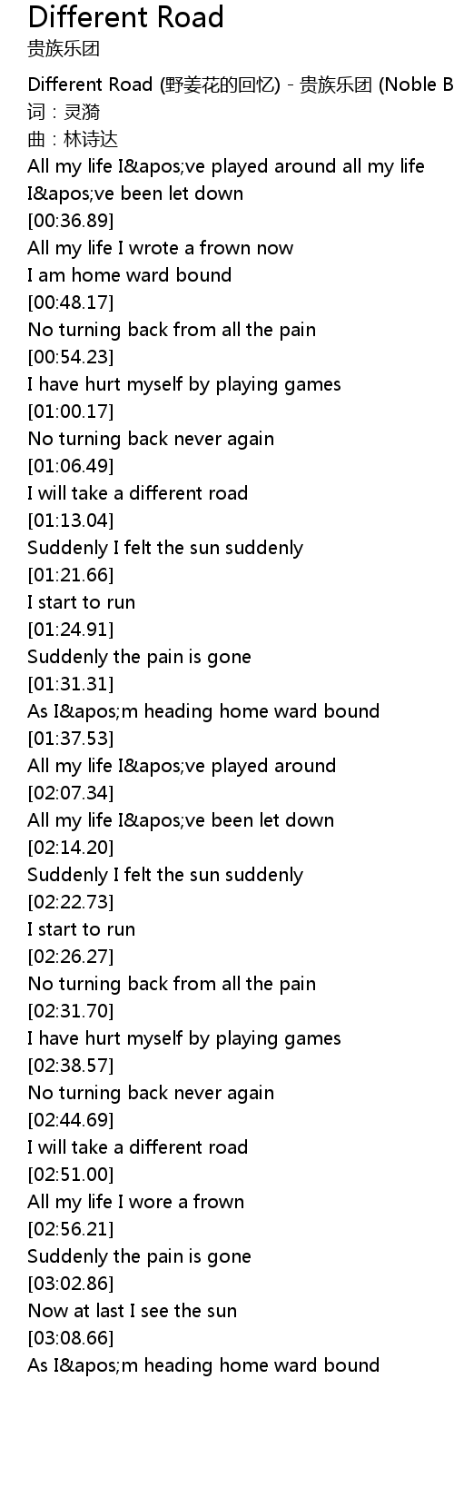 | [00:00.00] | Different Road yě jiāng huā de huí yì guì zú yuè tuán Noble Band |