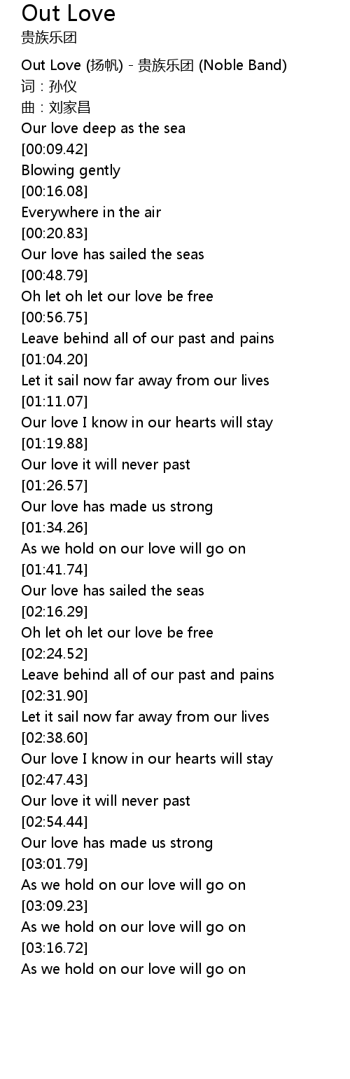 | [00:00.00] | Out Love (扬帆) - 贵族乐团 (Noble Band) |