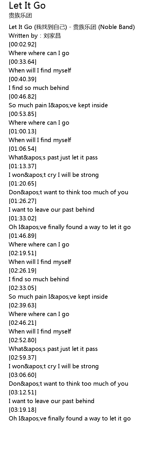 | [00:00.08] | Let It Go wǒ zhǎo dào zì jǐ guì zú yuè tuán Noble Band |