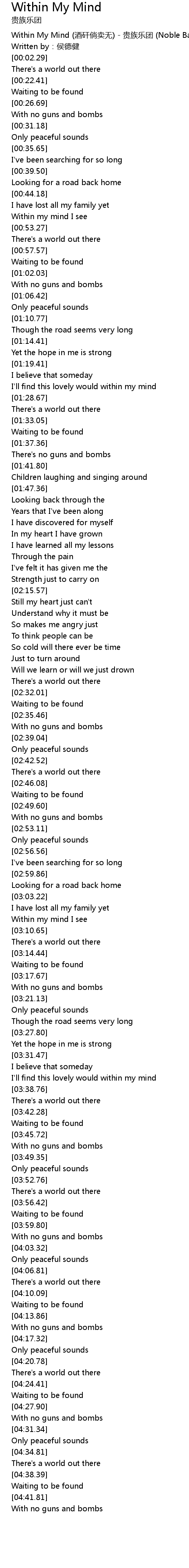 | [00:00.25] | Within My Mind jiǔ gān tǎng mài wú guì zú yuè tuán Noble Band |