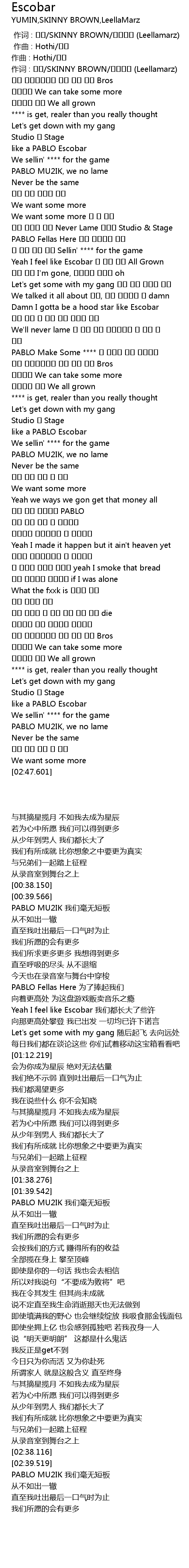 | [00:58.398] | Yeah I feel like Escobar 좀 컸어 우린 All Grown |