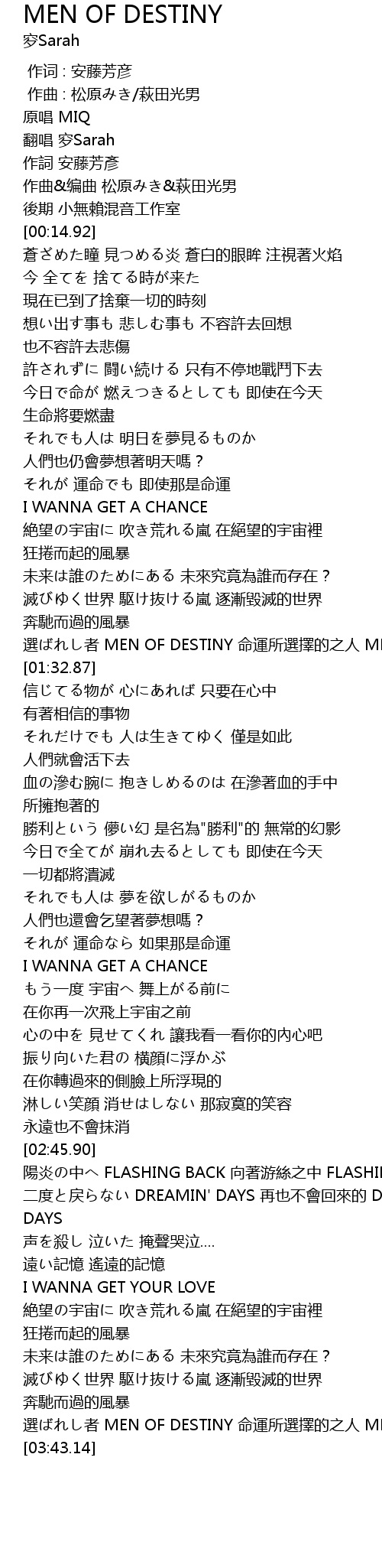 | [03:38.14] | 選ばれし者 MEN OF DESTINY 命運所選擇的之人 MEN OF DESTINY |