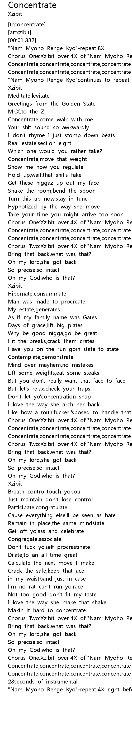 | [02:01.110]Chorus One:Xzibit over 4X of "Nam Myoho Renge Kyo"] |