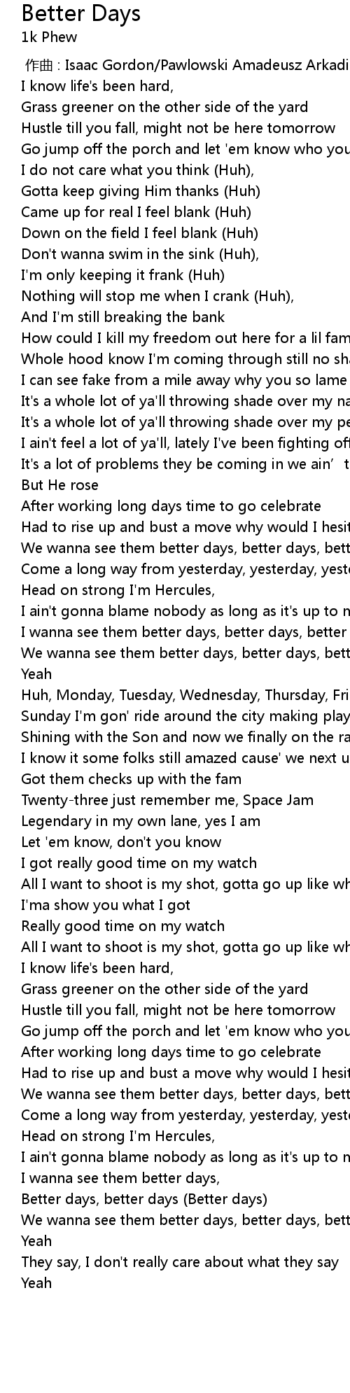 | [01:09.58] | We wanna see them better days, better days, better days |