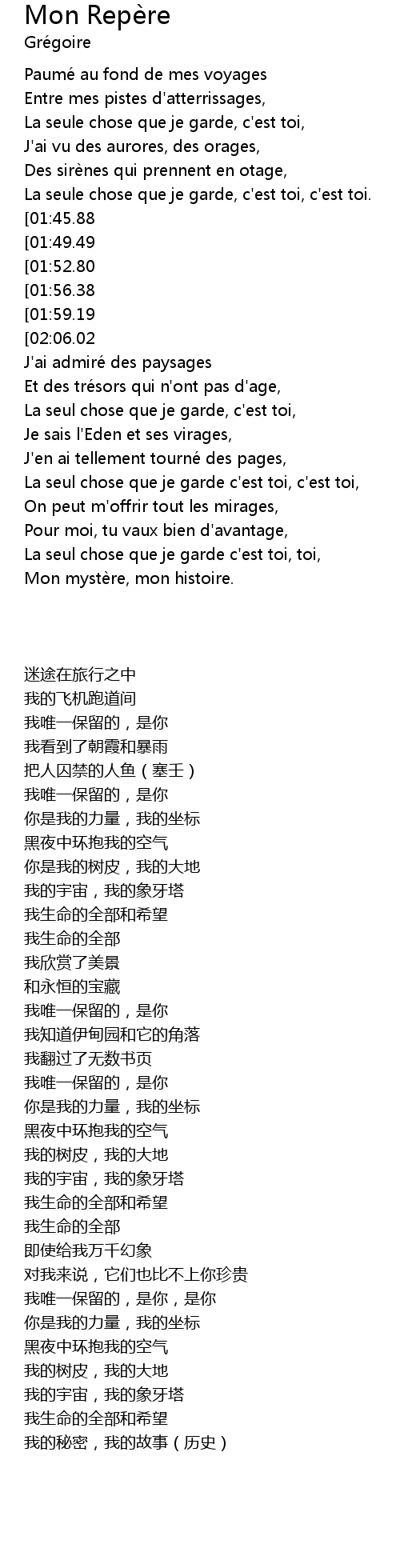 | [00:49.42][01:45.88][02:29.47] | Tu es ma force et mon repè re, |